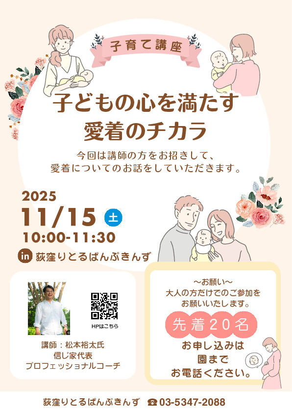 2025/11/06 ニュース 子育て講座特別企画 講師の方をお招きして「子どもの心を満たす愛着のチカラ」についてお話をしていただきます。 たくさんのご参加お待ちしております!! Preview TOPICS